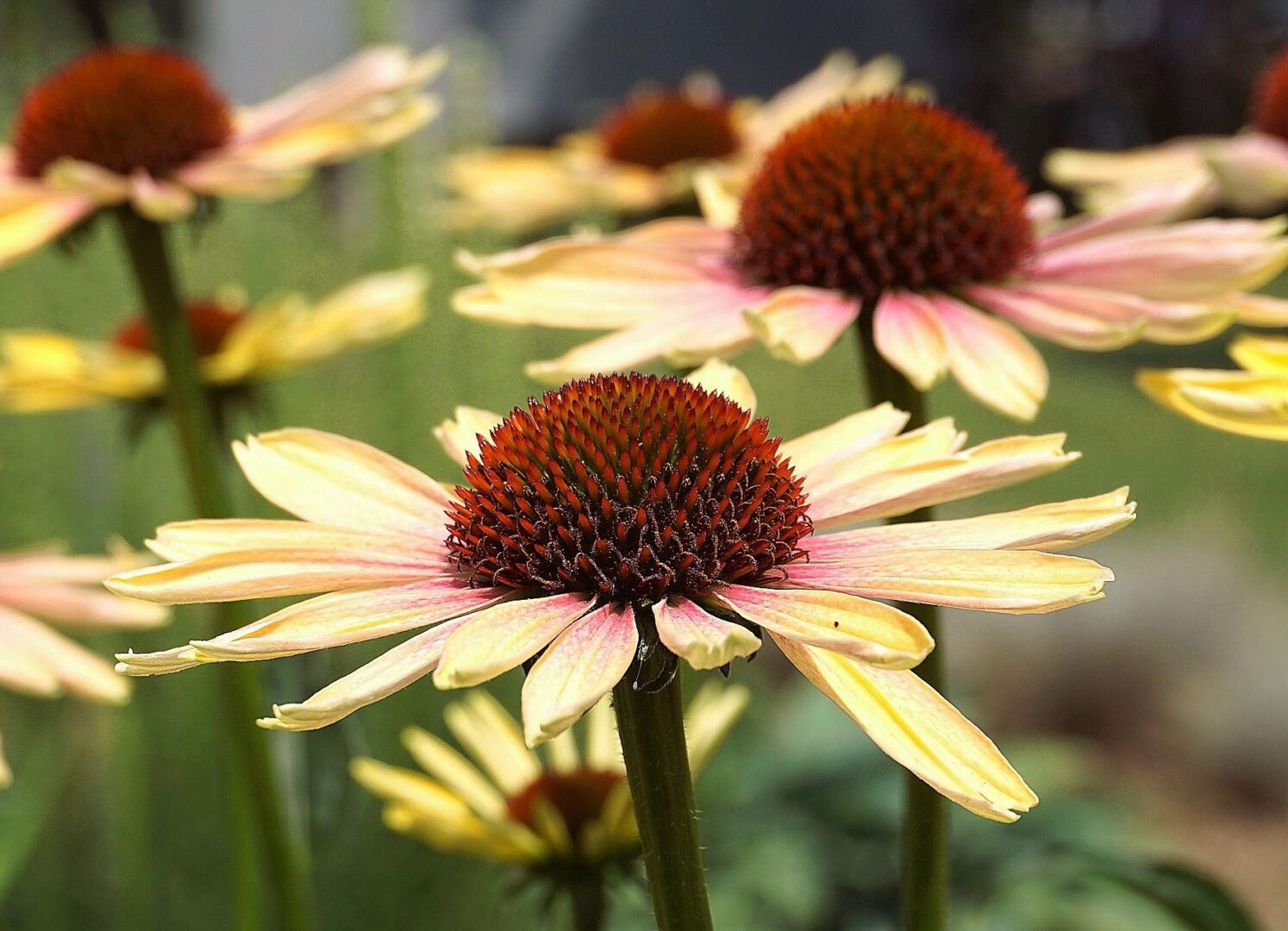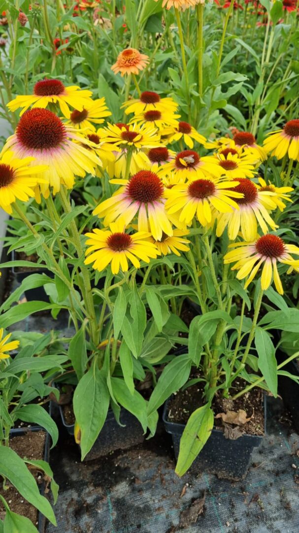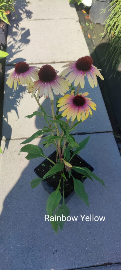 Cudowna, mało spotykana odmiana w kolorze żółtym z domieszką różu. Nasada płatków ma nie jednoznaczny kolor, który zmienia się w trakcie kwitnienia. Jeżówka “Rainbow Yellow” dorasta do ok. 60 cm Ma sztywne pędy, nie pokładają się, zdobione jajowatymi, ostro zakończonymi liśćmi, które osadzone na długich ogonkach. Cała roślina pokryta jest szorstkimi włoskami. Kwitnie od lipca do września. Bylina przeobraża się wówczas w spektakularny, jaskrawy bukiet, wypełniony mnóstwem uroczych, miododajnych koszyczków kwiatowych, które stanowią cenne źródło nektaru dla owadów zapylających. Wypukłe oczka przypominające kolce jeża, otoczone są kwiatami języczkowymi. Bez wątpienia jeżówka purpurowa “Rainbow Yellow” to jedna z najpiękniejszych odmian, mało wymagająca odporna i łatwa w uprawie.